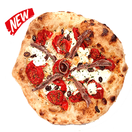 Pomodoro San Marzano DOP, Mozzarella fior di latte “Caseificio La Majelletta”, Provola affumicata “Caseificio La Majelletta”, Pancetta tesa affumicata “Antica Salumeria”, Rucola, Funghi porcini “Petrucci”, Pachino